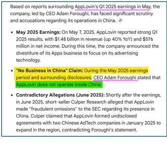 2025年5月7日,在一季度财报电话会议上,面对全球投资者关于中国业务的质询,AppLovin CEO Adam Foroughi 斩钉截铁地宣称:“AppLovin 不在中国境内运营 (AppLovin does not operate inside China)” 。