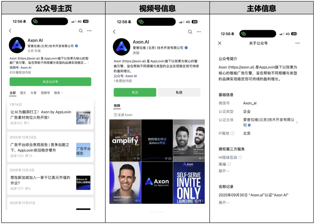 官方认证账号:微信公众号“Axon AI”和相关视频号,认证主体均为“爱普拉维(北京)技术开发有限公司”。