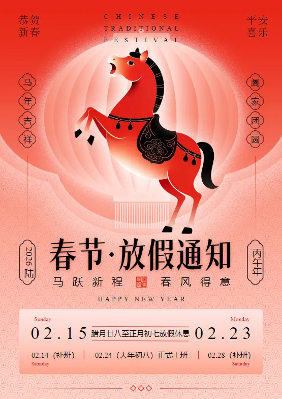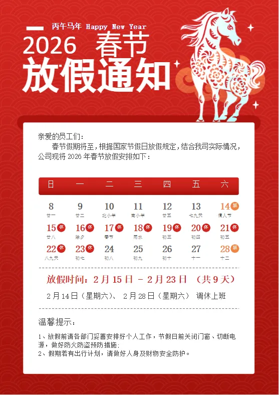 各位打工人 / 行政同学看过来!2026 马年春节放假通知不用自己写啦 —— 这份 Word 模板直接填公司信息、调放假日期就能发,自带 “春节注意事项 + 工作交接提醒” 模块,连格式都帮你排好咯~