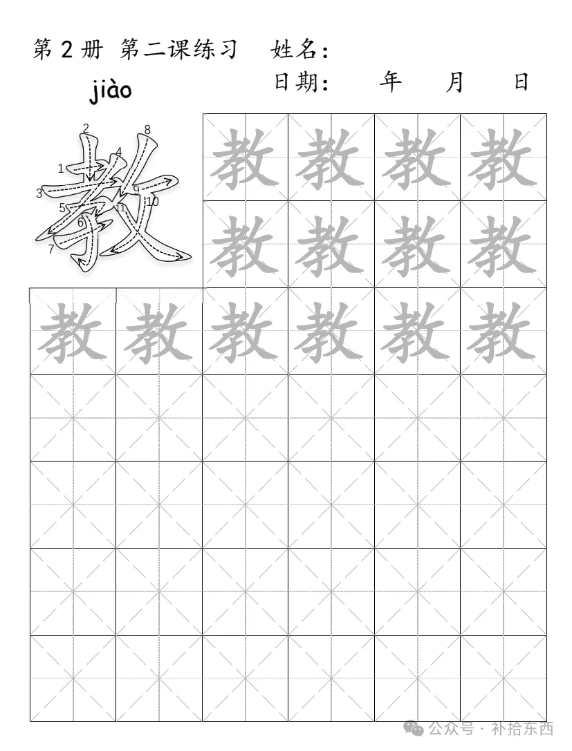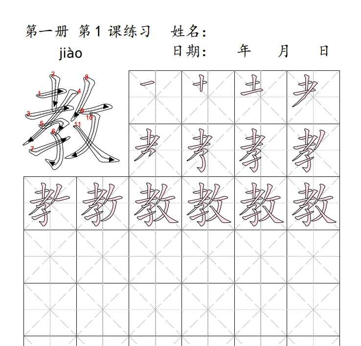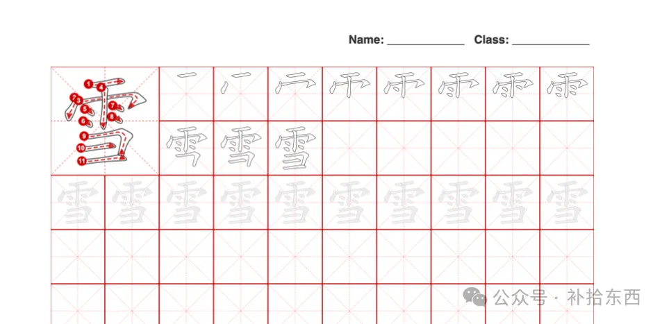 生成一张Letter尺寸的pdf格式的练字worksheet。之前生成的图片作为参考放在左上角,占两行空间。图右边的两行用米字格呈现这个字的笔顺图,每一格比上一格多一划,从第一划一直到最后一划,在右边两行呈现出来。下面的第三行以米字格形式给出这个字的完整形式,供用户摹写用。下面的几行呈现空白米字格,供用户练习用。