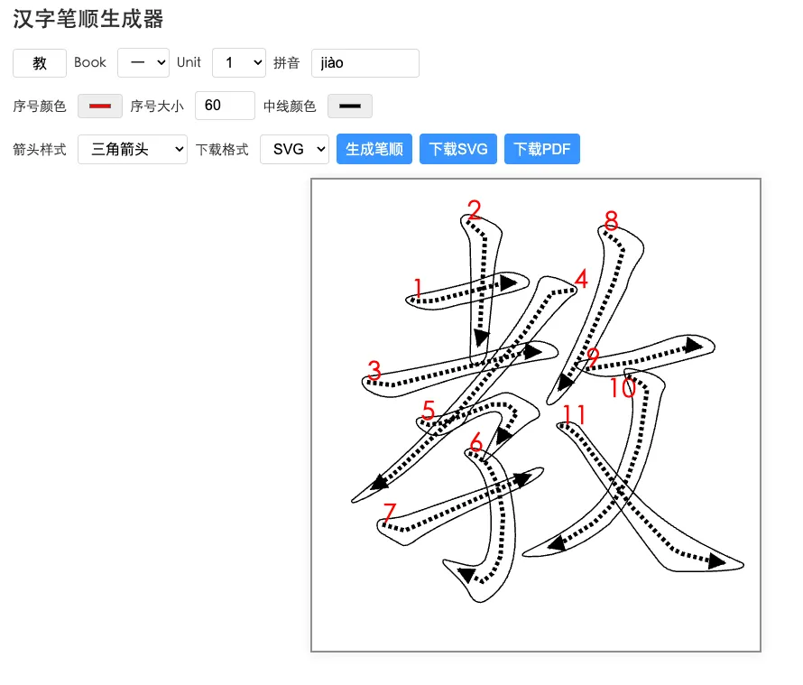 我觉得人工制作这种Worksheet太费功夫:先要做出空心字,然后在空心字里用虚线箭头标出笔顺,在笔画起始处标上数字,放到手工绘制的米字格中。于是,我请教了一位编程高手,问他能否通过编程实现。不几天,在AI辅助下,目的完美达成,他帮我设计了一款在线工具,只需输入汉字,经过几个设置,就能得到可以下载的pdf版Worksheet。