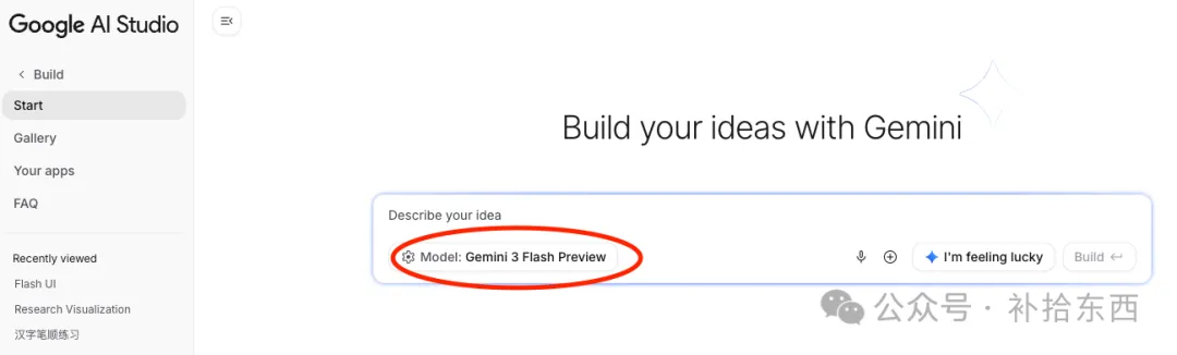 使用Google AI Studio,前提是你有个谷歌账号,在国内需要想办法,用ai.dev这个简短的网址就可以登录。打开的这个界面默认的就是创建应用程序的Build页面,红圈处可以选择模型,我是小白,用的是默认的Gemini 3 Flash Preview,如果需要调整模型,点击红圈这里就好,模型之间的区别请自行科普。