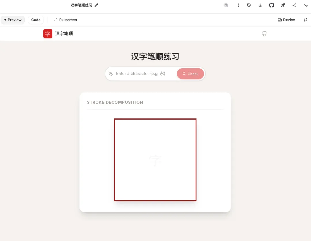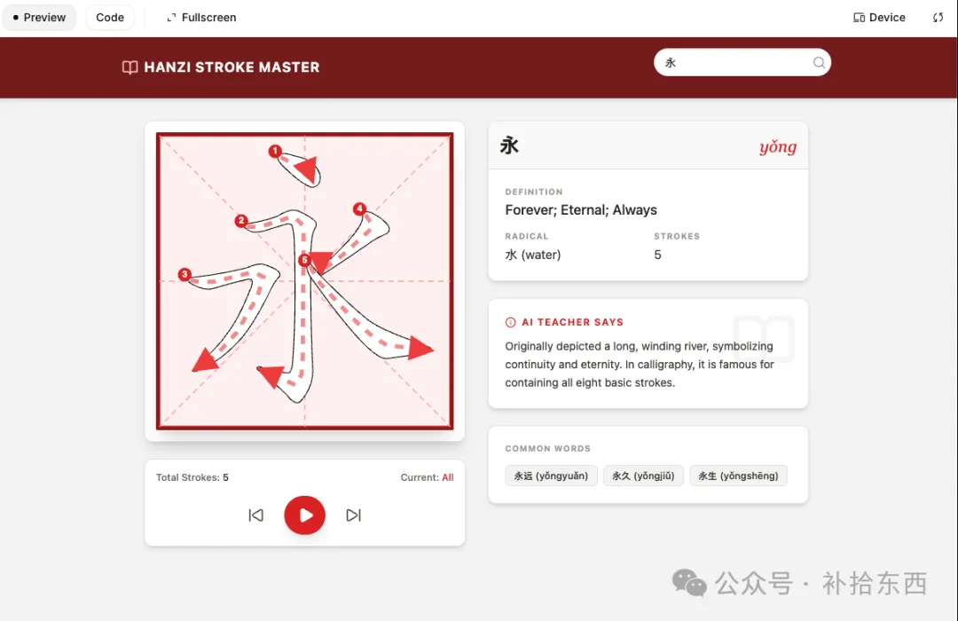 很显然,AI比我考虑得要更缜密一些,除了笔画演练之外,还加了右边这些需要调用AI的东西,尽管有趣且有用,但有插入小广告之嫌,后来被我统统去掉了。(此图是后来为了写这个文章重新生成的,并非第一次生成的样子。目前AI的一大缺陷是使用同样的提示词,每次生成的结果都不同。第一次生成一个丑八怪,也未可知。)