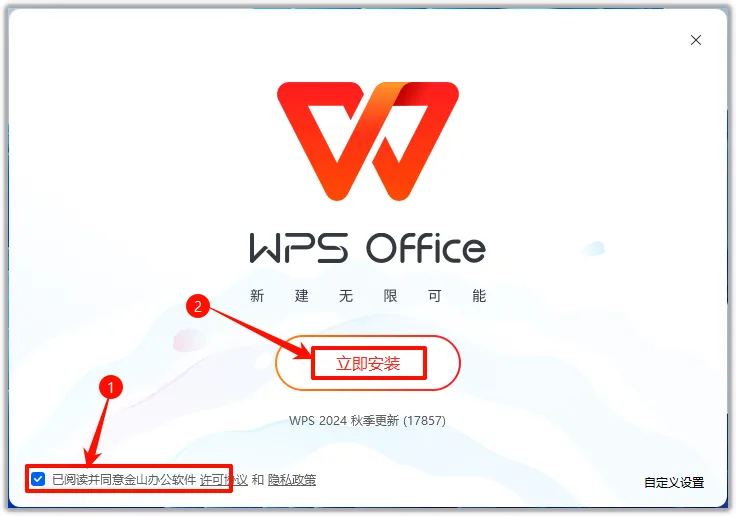 4、默认安装路径:①勾选【我已经阅读并同意金山办公软件许协议】②点击【立即安装】