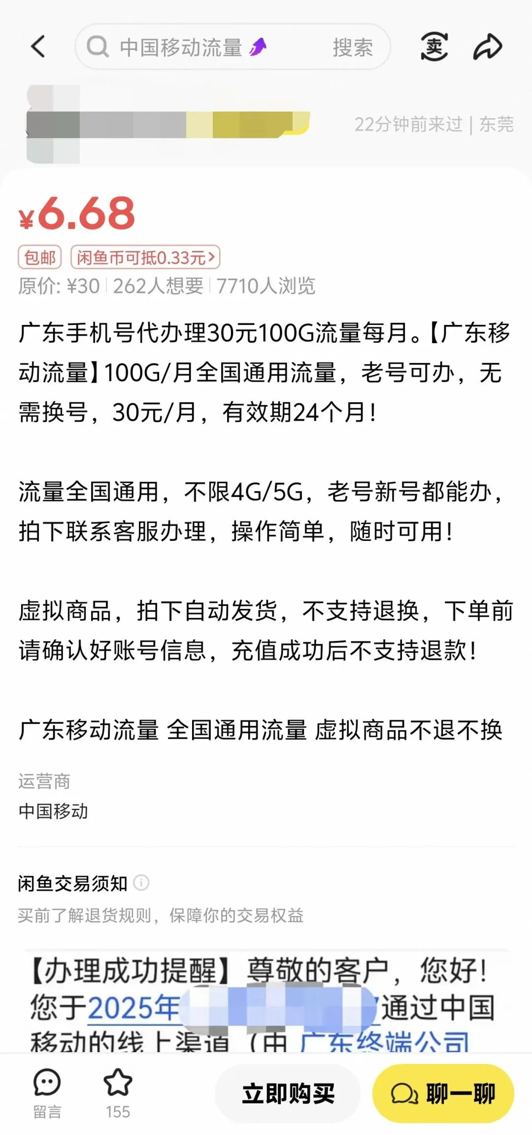 今天在逛小黄鱼的时候,发现有人收费代办理30元100G流量,还卖出了几十份这样也行? 先把小黄鱼的图贴给大家看看。