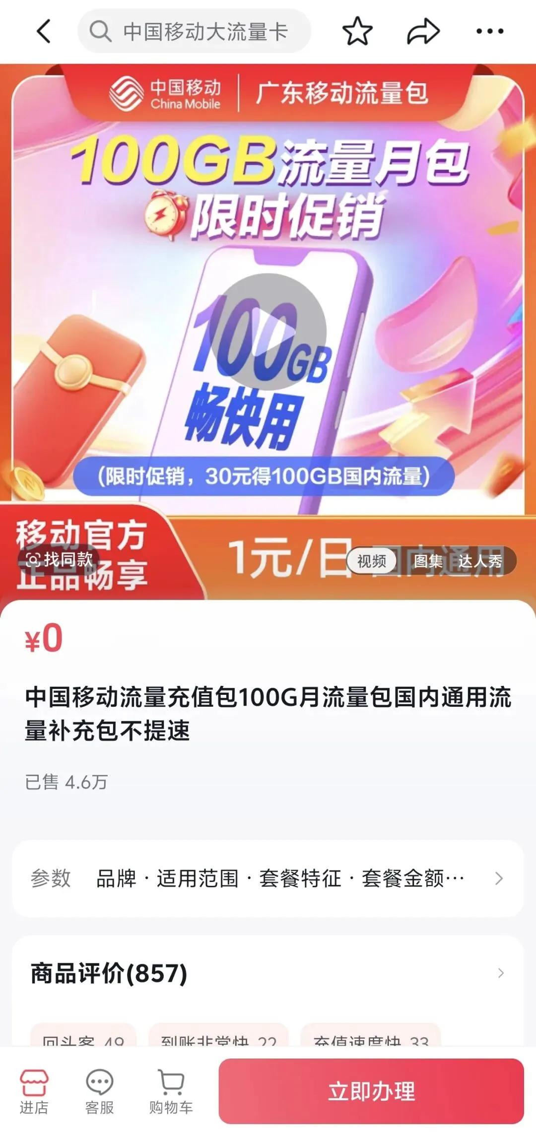 这个100G流量是要收费的,每个月30元,合约是24个月,但的确比在中国移动APP买要便宜。