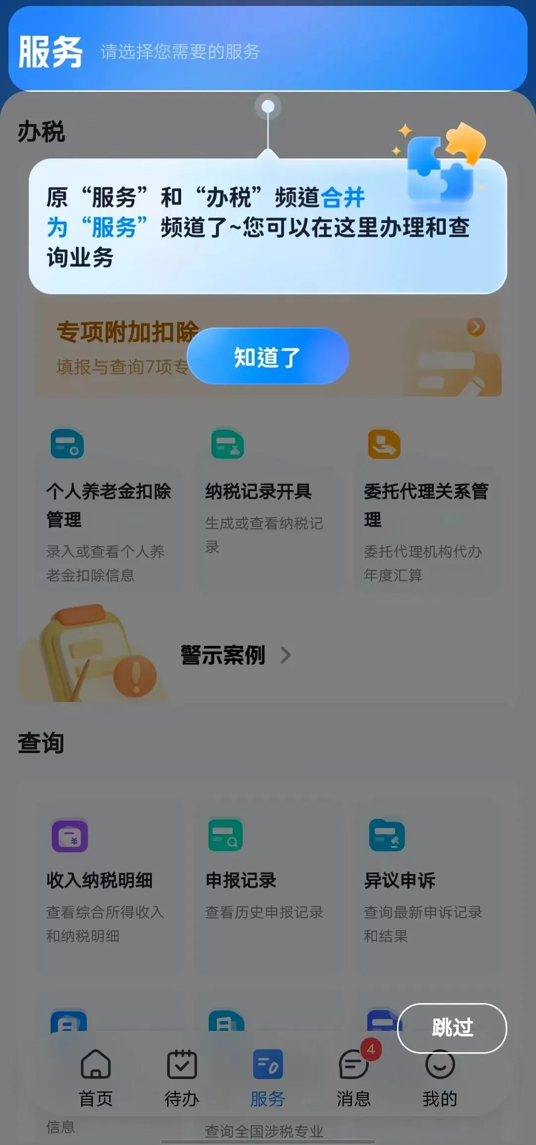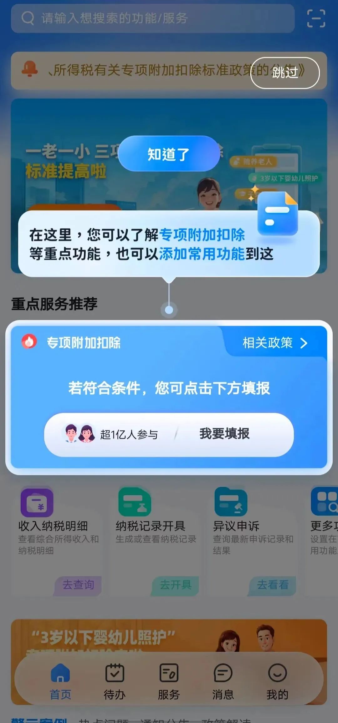 近日,个人所得税APP更新至2.0.0版本,门户界面设计全新升级,优化功能分类,新增“待办”频道等功能模块,快来跟着小编一起体验吧~