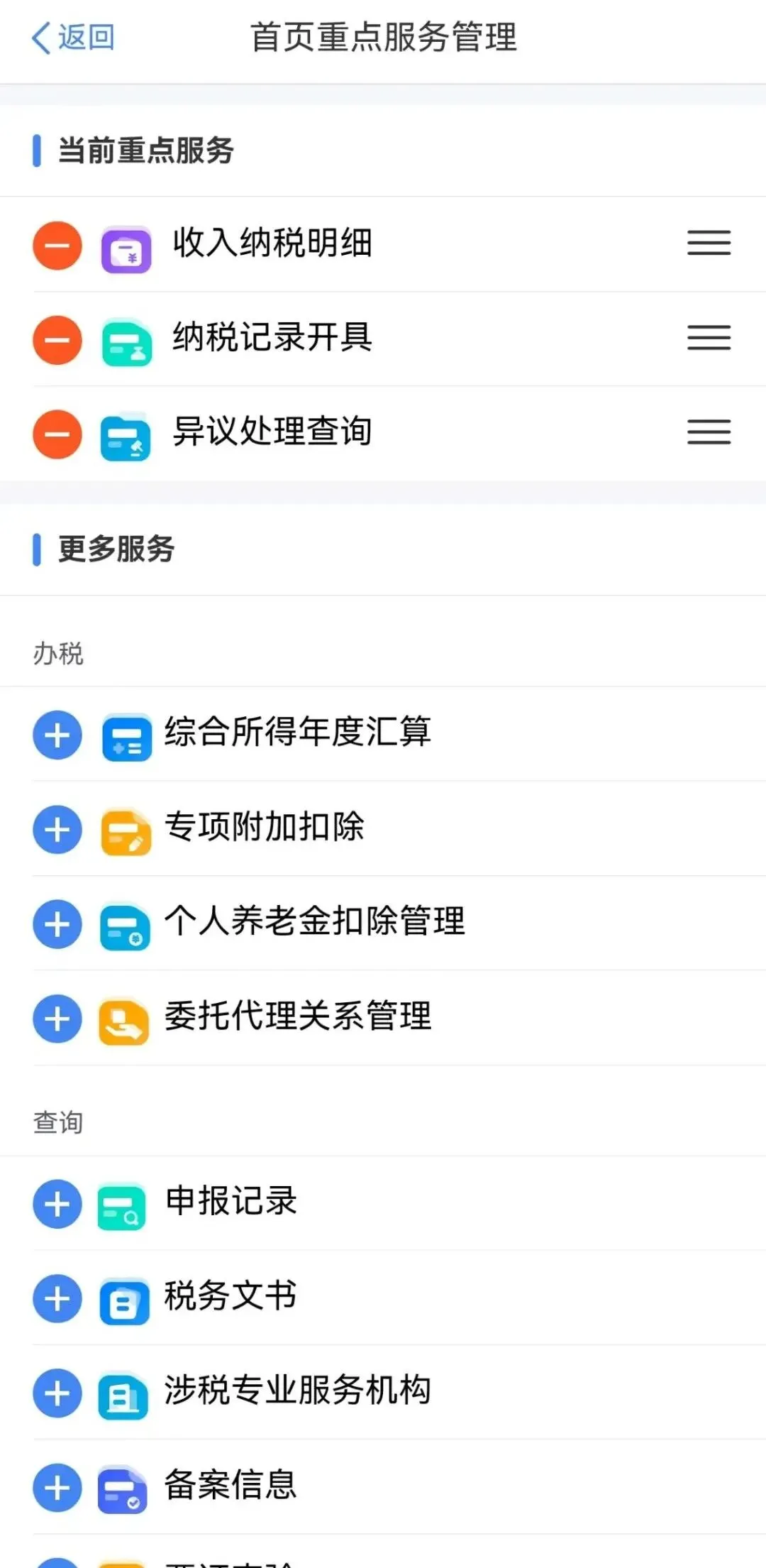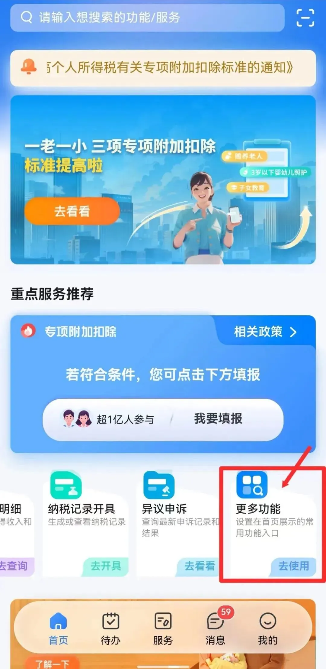 点击【更多功能】,可添加、删除重点服务标签,将您常用的功能设置在首页展示,一点即达。