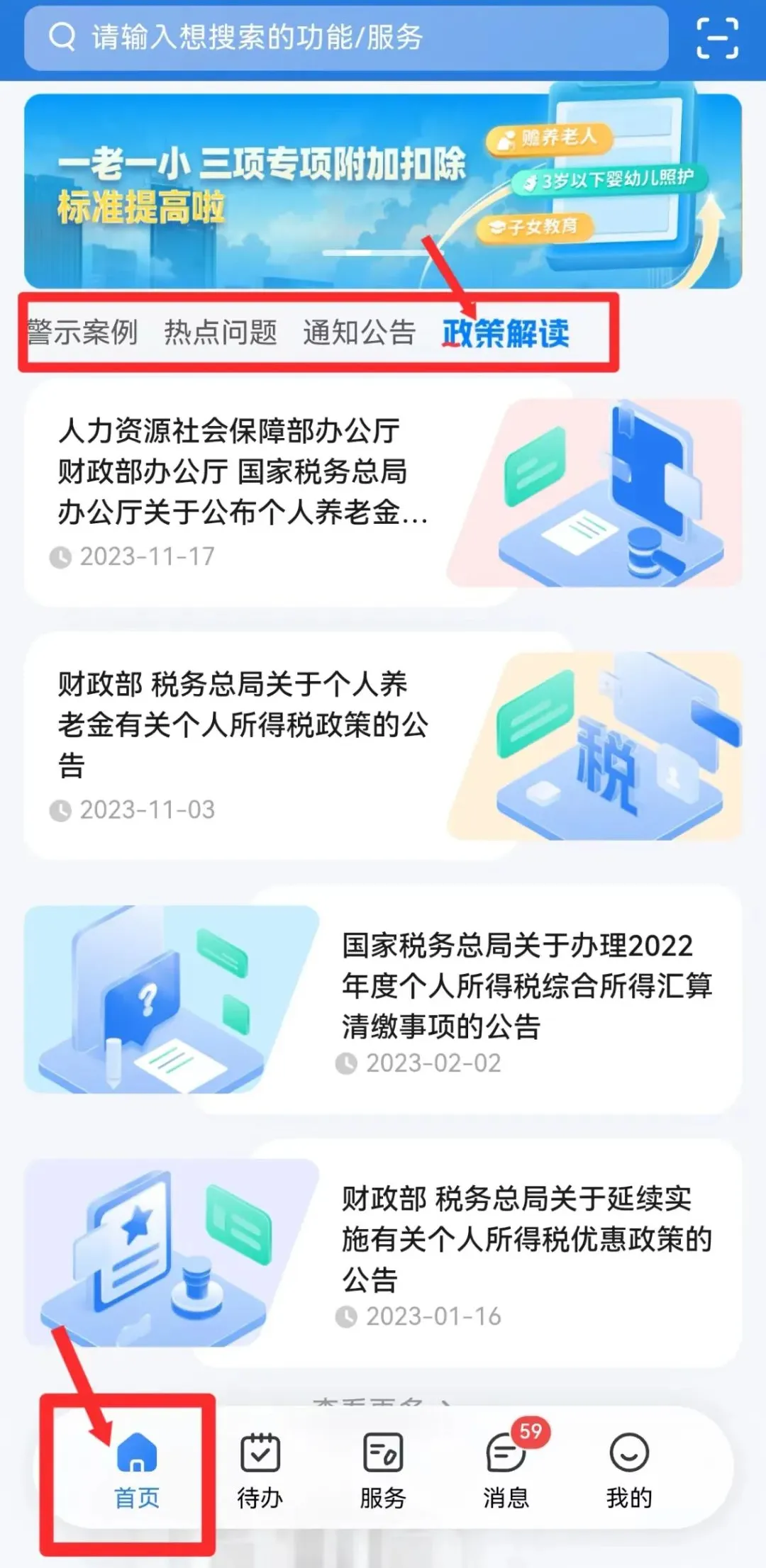 【首页】展示【警示案例】【热点问题】【通知公告】【政策解读】,点击翻阅了解,助您正确申报纳税。