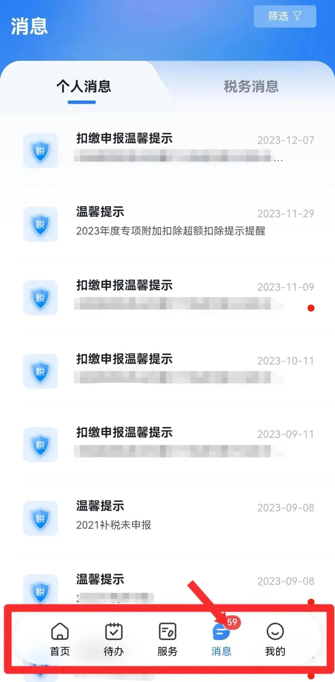 点击导航栏【消息】,查看“个人消息”/“税务消息”。请及时查阅消息提示,了解或办理相关业务。