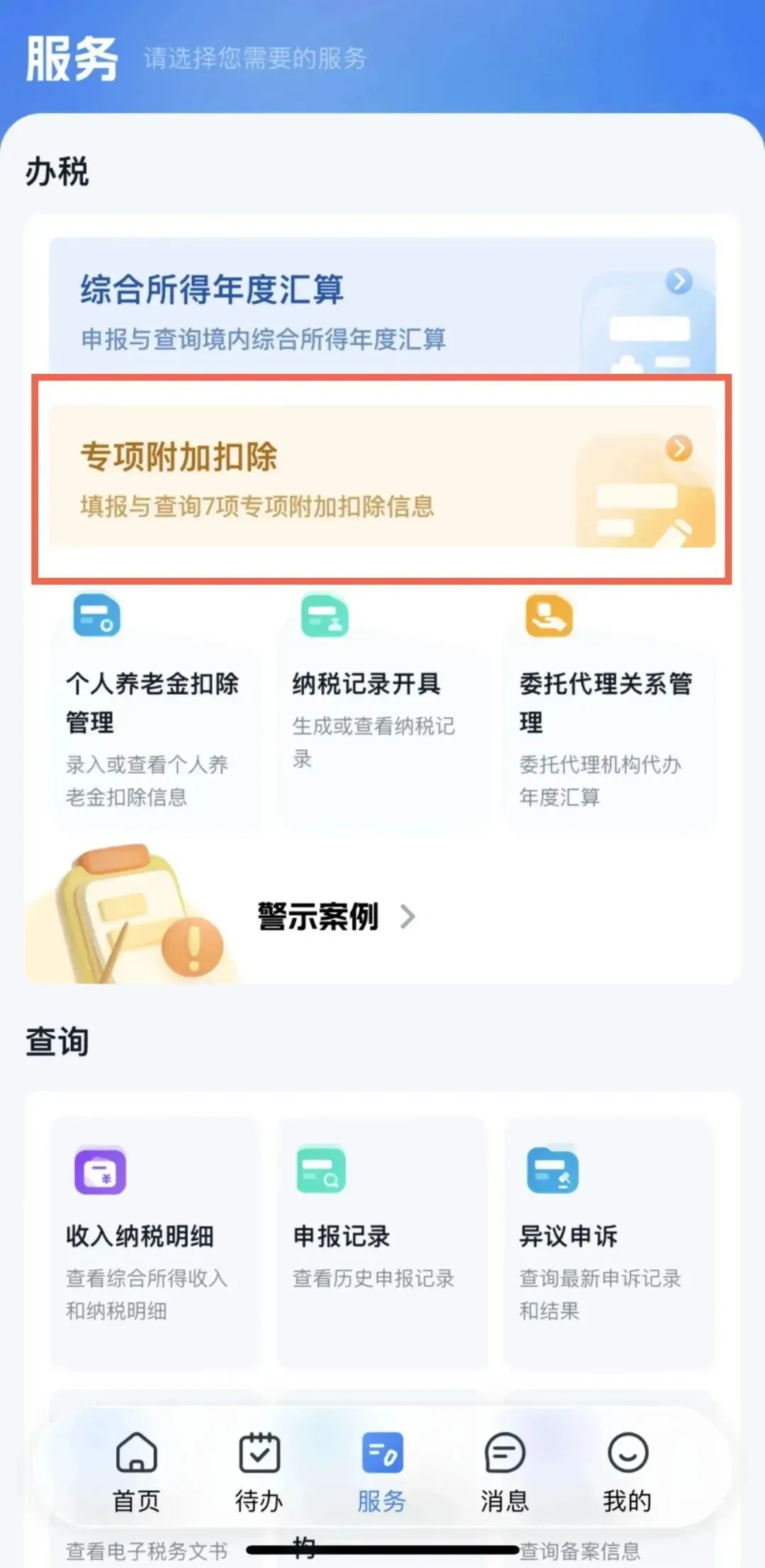 通过“专项附加扣除”功能,可以填报3岁以下婴幼儿照护、子女教育、继续教育、大病医疗、住房贷款利息、住房租金、赡养老人7项专项附加扣除信息。