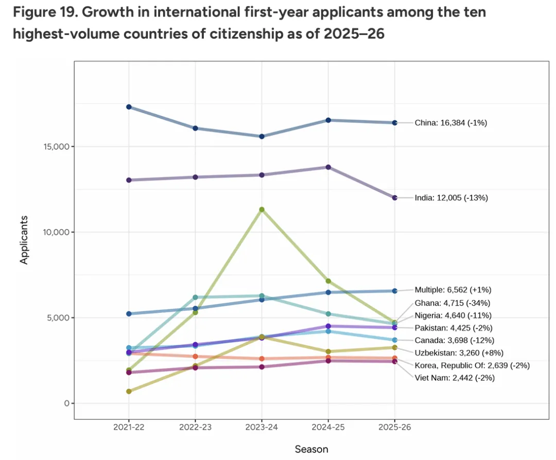 在此背景下,中国申请者的表现相对稳定。截至2026年1月1日,中国申请者为16,384人,同比仅下降1%,仍是美本申请中人数最多的国际生来源国。
