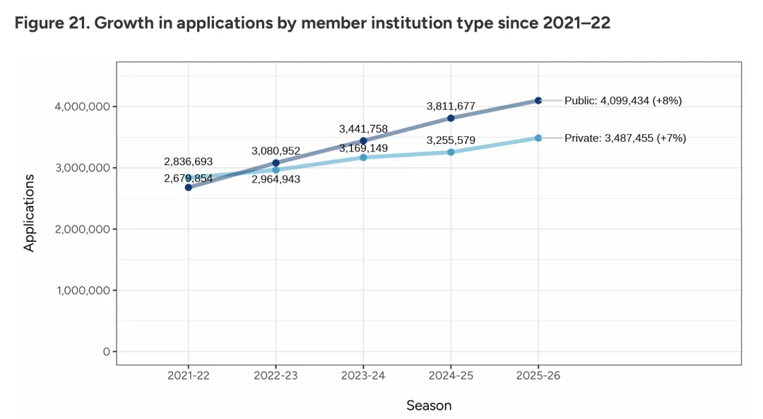 从申请者行为看,同时申请公立与私立大学的人数同比增加6%,而仅申请公立或仅申请私立的人数保持不变。