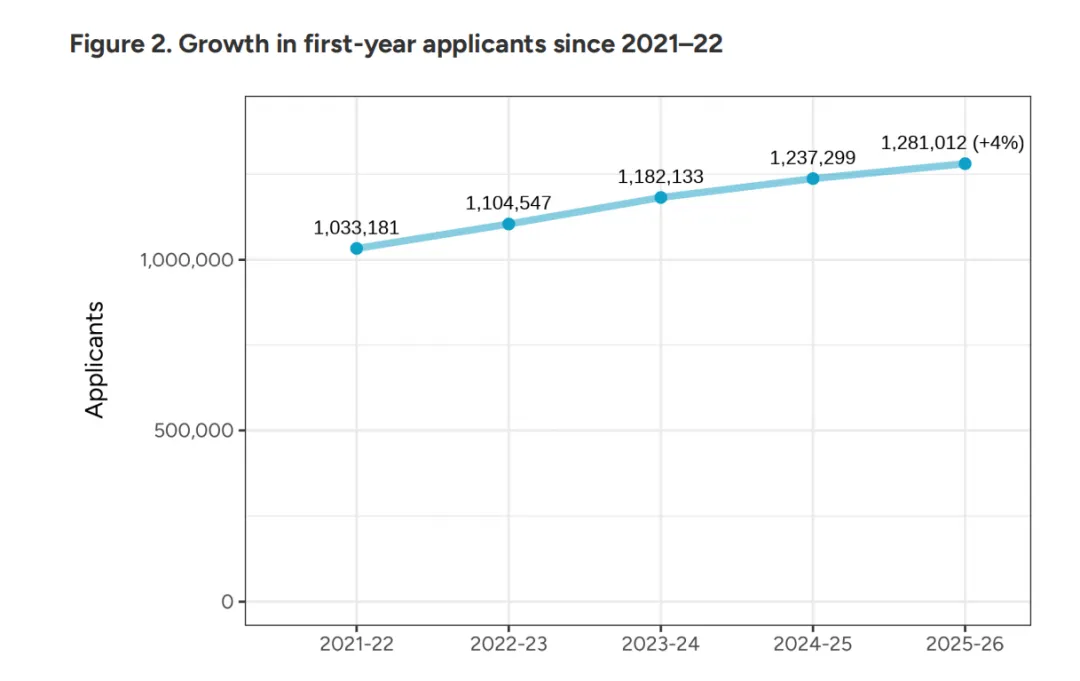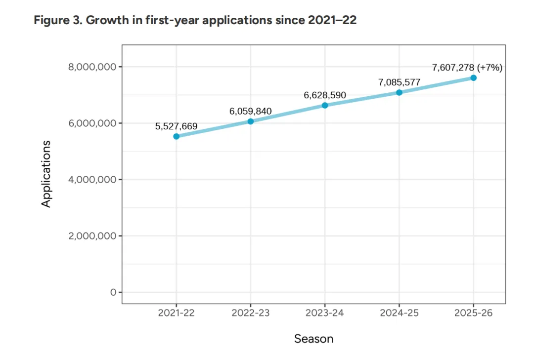 截止到元旦,全球共有约128万名学子跃跃欲试,递交了超过760万份申请材料。与去年相比,申请人数增长了4%,而申请总量更是攀升了7%。