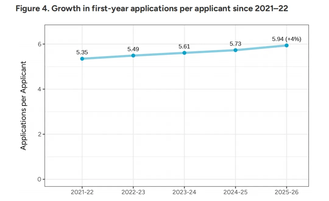 这其中隐藏着一个耐人寻味的细节:平均每位学生申请的学校数量已经从去年的5.73所增加到了5.94所。