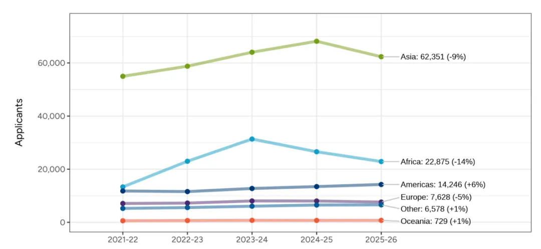 在整体申请人数上升的背景下,国际申请者却减少了7%,这也是自去年11月早申数据发布以来的又一次“爆冷”。非洲与亚洲其他地区的申请者大幅缩减,这或许与全球经济波动及签证政策收紧不无关系。