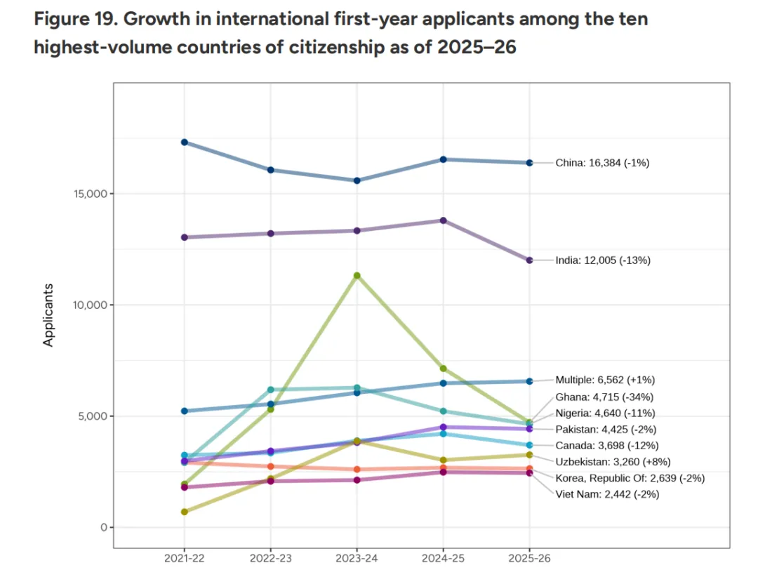 然而,中国申请者的表现却极其稳健。16,384名中国学生递交了申请,同比仅微降1%。