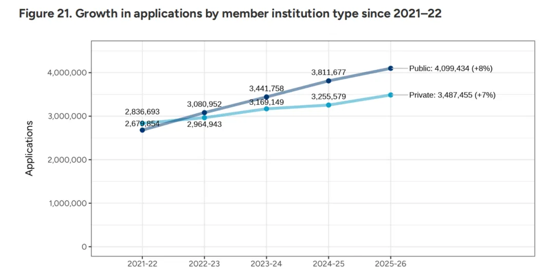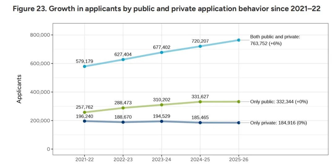 在择校偏好上,公立大学依然是申请的大头,凭借其相对低廉的学费和丰厚的奖学金,吸引了超过一半的申请量。但值得注意的是,私立大学正通过“精英教育”与“差异化特色”紧追其后,公私立大学申请增速的差距正在缩小。