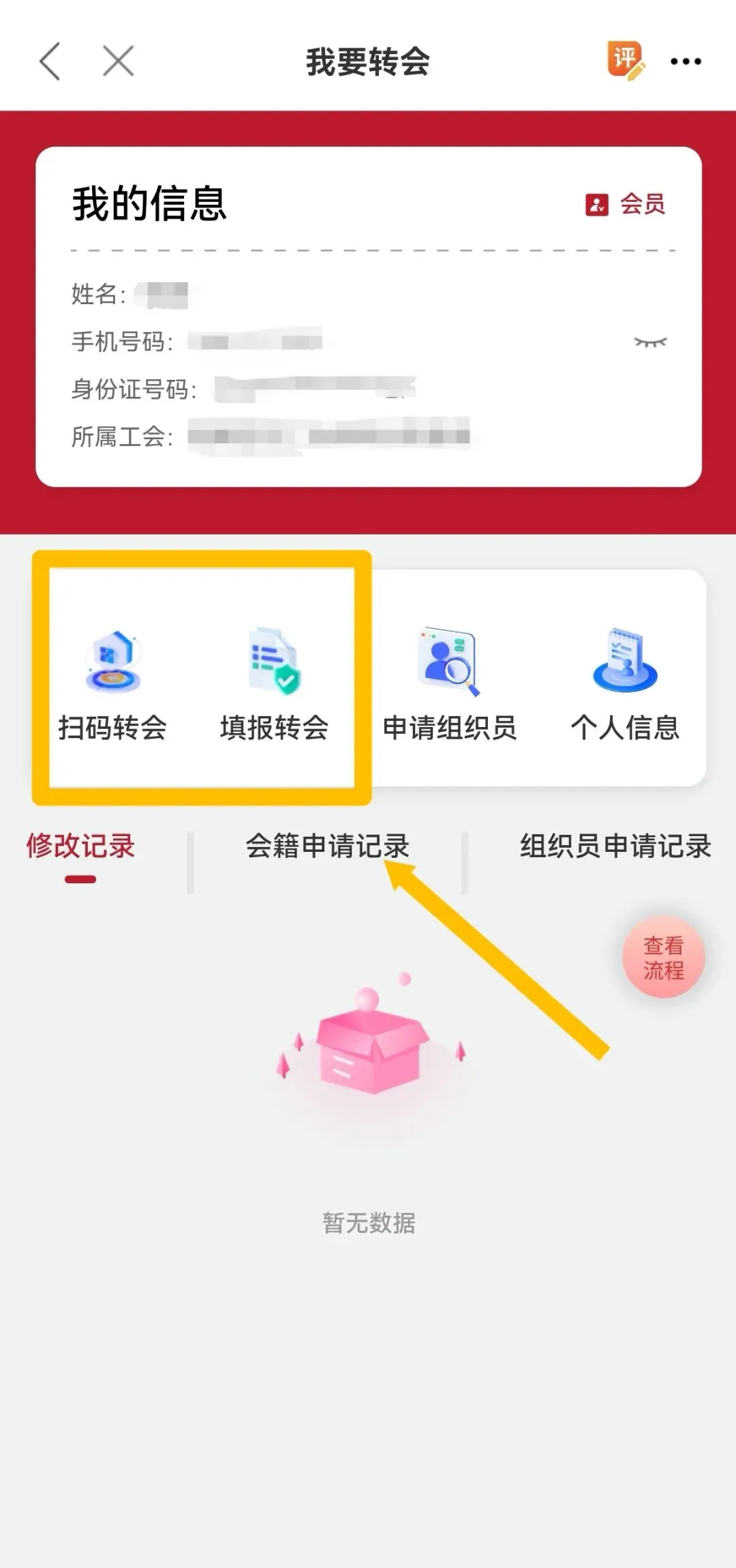 2.找到 “职工服务区”,点击【入会转会】(新用户可选扫码 / 填报入会,已入会职工选择转会);