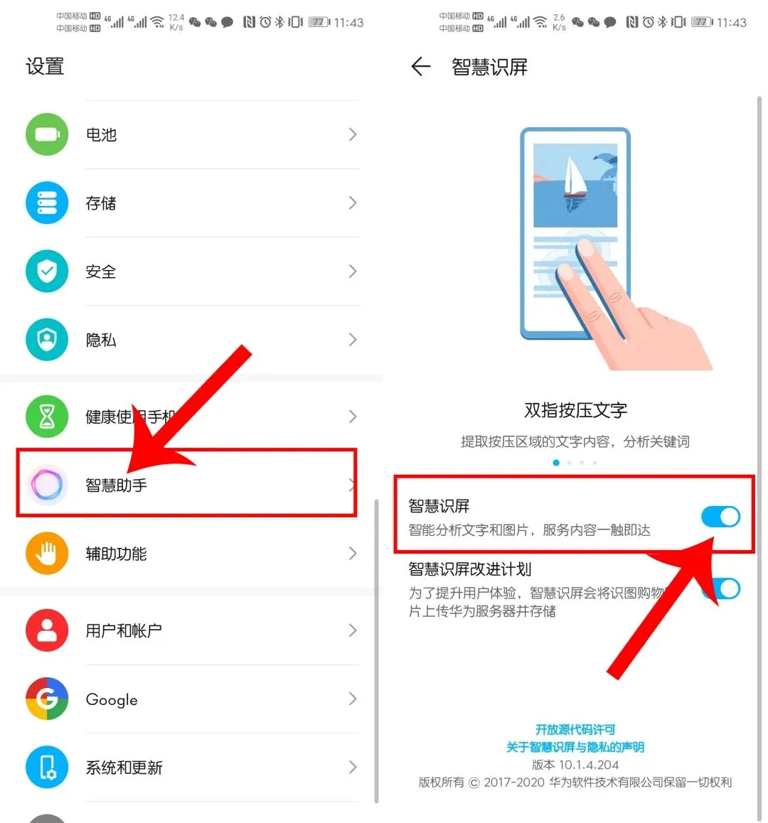不过这功能刚买手机时可没有 有天我想用却怎么按都没反应 急得我抓耳挠腮 后来翻说明书才发现 得先在设置里打开’智慧识屏’ 我按照提示点进设置→智慧助手→智慧识屏 把那个开关往右一滑 嘿 立马就能用了 现在这功能成了我的办公神器 连打印机都快积灰了