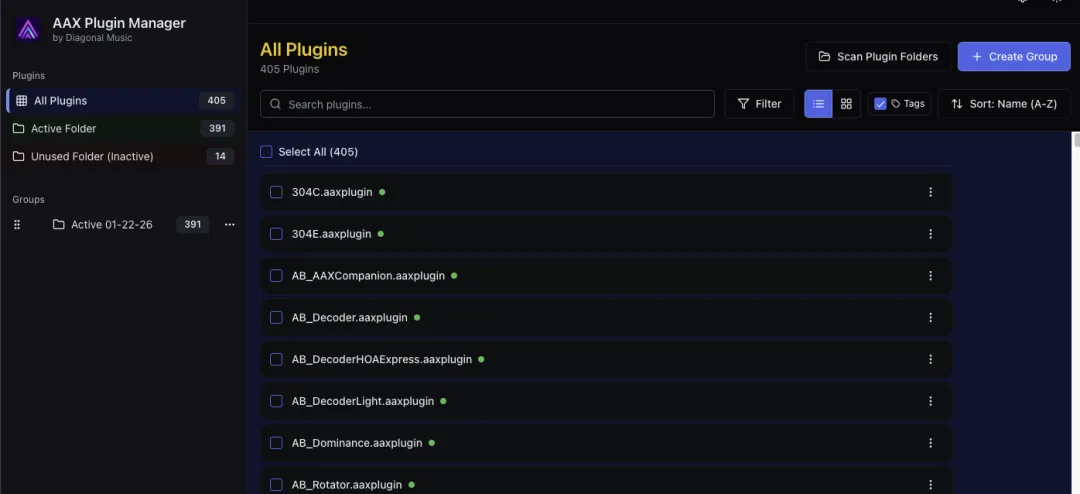 这款名为“AAX 插件管理器”的第三方软件专为 Pro Tools™ AAX 插件文件设计——创建组、标签、搜索和筛选,在列表和组内快速移动插件,将插件从当前的插件文件夹中移动。