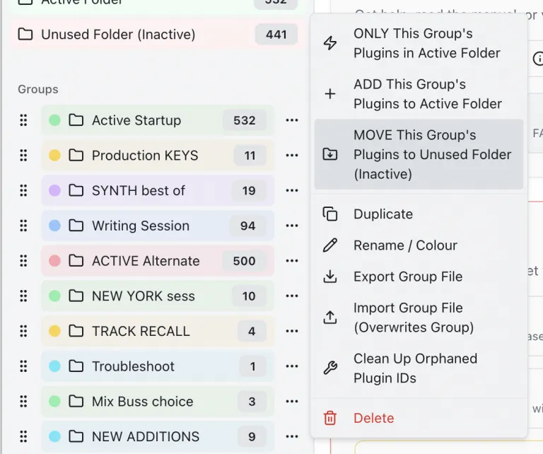 4.当然是你有了第一个快照!要导出你的第一个组:在该组旁边的横向 3 点菜单中,选择“导出组文件”。它会生成一个该名称的文本文件,你可以保存到电脑上。这个组文件可以之后重新导入到空的或已经填充的组(覆盖它)——需要做的是创建一个安全的启动快照状态,点击菜单上的“仅”会把这些文件移回活动文件夹,当前的插件活动插件都被移除——所以如果你移动插件,可以回到你出错前的 Pro Tools™活跃插件文件夹状态。