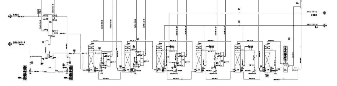 先给大家看一下我们最近做的一个废气处置项目,废气中含有盐酸和硫化氢,采用一级降膜吸收结合二级水吸收,硫化氢采用三级氨水吸收塔,这是工艺流程图,管路也不少,主体材料采用PPH材质