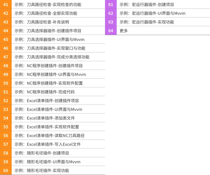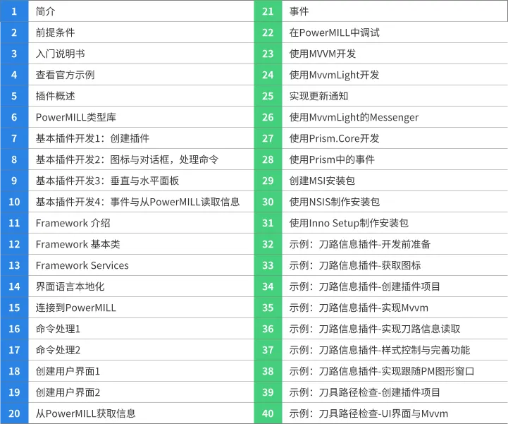 PowerMILL 插件开发【C#版】 PowerMILL 插件开发视频课程【C#版】现在开售。感兴趣的宝子们,可以到淘宝店铺【老何软件】查看。 以下为课程的介绍 课程的目录 有需要的朋友,可以在淘宝店铺《老何软件》购买。如有疑问,请及时提出。