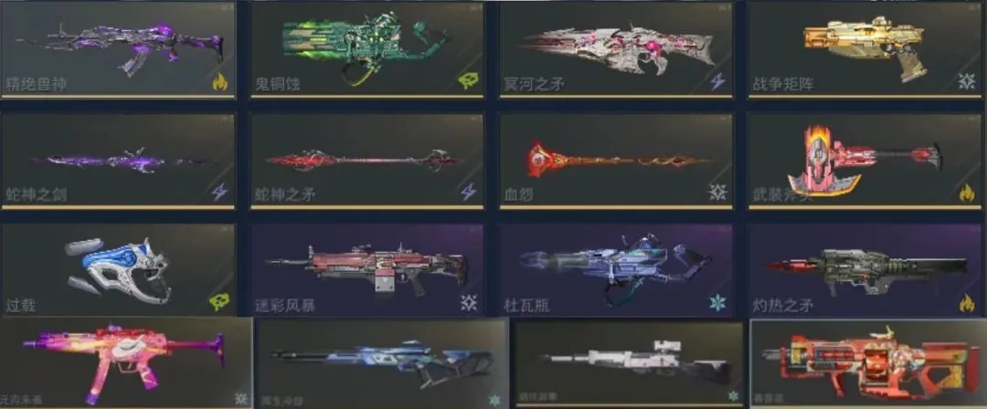 一共20把,8把金武,据目前体验服的测评,最强的是冥河之矛(雷电版的纯白),射速快伤害高!小花建议大家近期把金枪自选留着,等S1开启后换新枪。