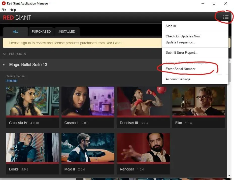 安装方法:先安装插件程序,最后点击左下角蓝色的Activate,在弹出Red Giant Application Manager中点击Cancel(无需登录),然后点击右上角的按钮,选择Enter Serial Number,依次输入插件序列号完成注册激活。