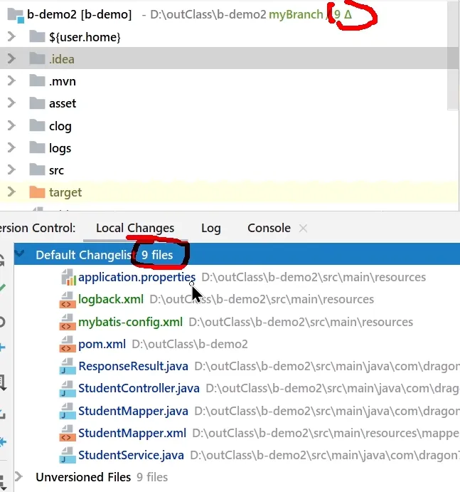 2.在左侧项目名上也会显示有几个文件未提交的提示