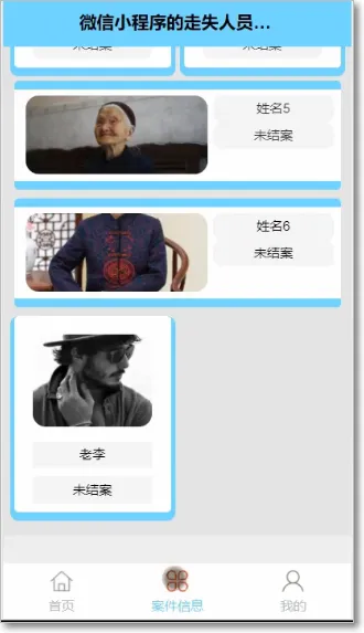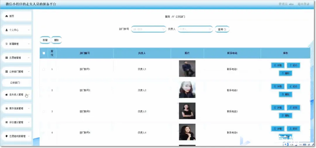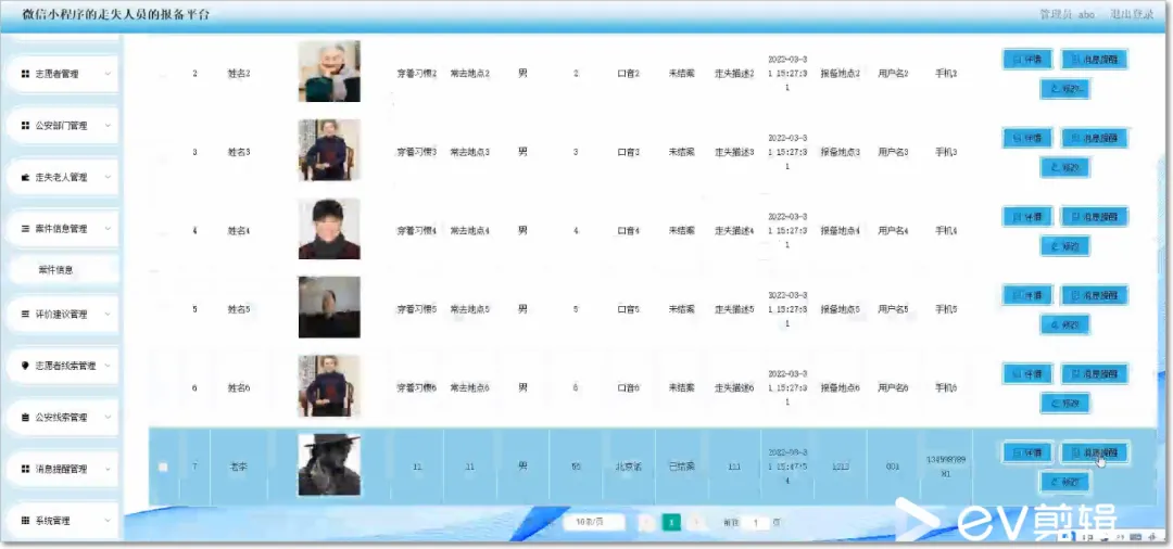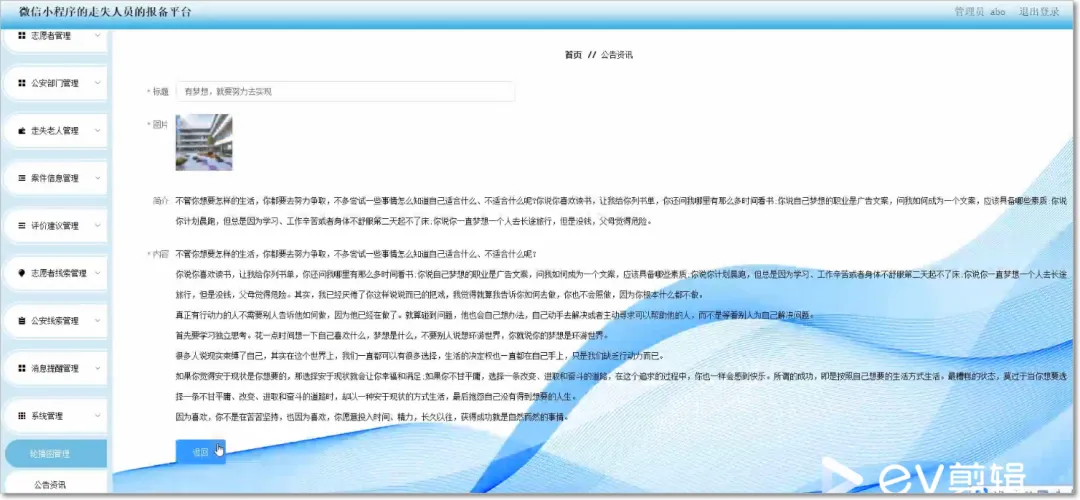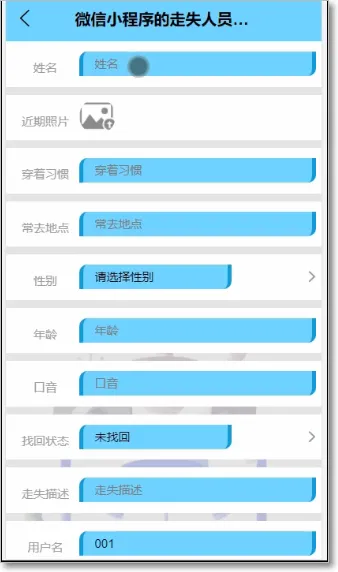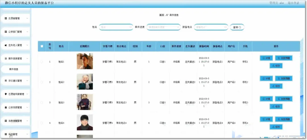 【万字文档+源码】基于微信小程序的走失人员的报备平台 已关注 关注 重播 分享 赞 视频详情 1.项目简介 基于微信小程序的走失人员的报备平台,万字文档+源码,资料齐全。一起加油,一起努力! 基于微信小程序的走失人员的报备平台有管理员,家属,志愿者,公安部门四个角色。管理员功能有个人中心,家属管理,志愿者管理,公安部门管理,走失老人管理,案件信息管理,评价建议管理,志愿者线索管理,公安线索管理,消息提醒管理,系统管理。家属,志愿者都可以注册,发布走失老人信息和查看其他人发布的信息。 2.项目技术栈 后端框架:ssm 前端:vue 小程序:uniapp 数据库:mysql 项目构建工具:maven 3.项目运行部分截图 4.项目万字文档 5.源码获取 关注熊猫IT技术公众号,获取客服人员二维码,扫码添加好友咨询!