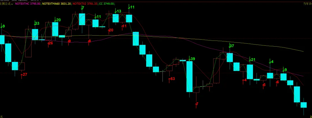 DRAWTEXT(C<REF(C,1)&&SUM( REF(C,1)-C,BARSLAST(C>REF(C,1)))>=4&&COUNT(C<REF(C,1)&&SUM( REF(C,1)-C,BARSLAST(C>REF(C,1)))>=4,BARSLAST(C>REF(C,1)&&SUM( C-REF(C,1),BARSLAST(C<REF(C,1)))>=4)+1),H,’↓’),COLORGREEN,FONTSIZE30,VALIGN2;