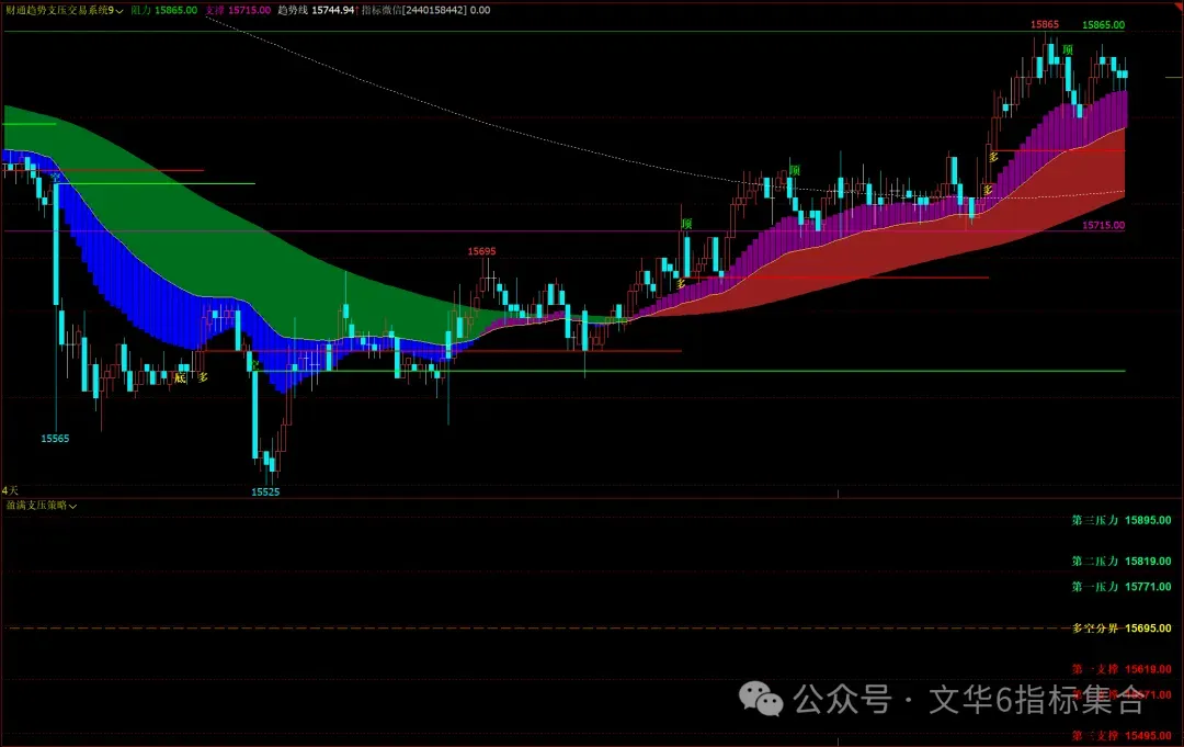 乾坤趋势支压系统主图:多空多空彩带,支撑压力画线,趋势线