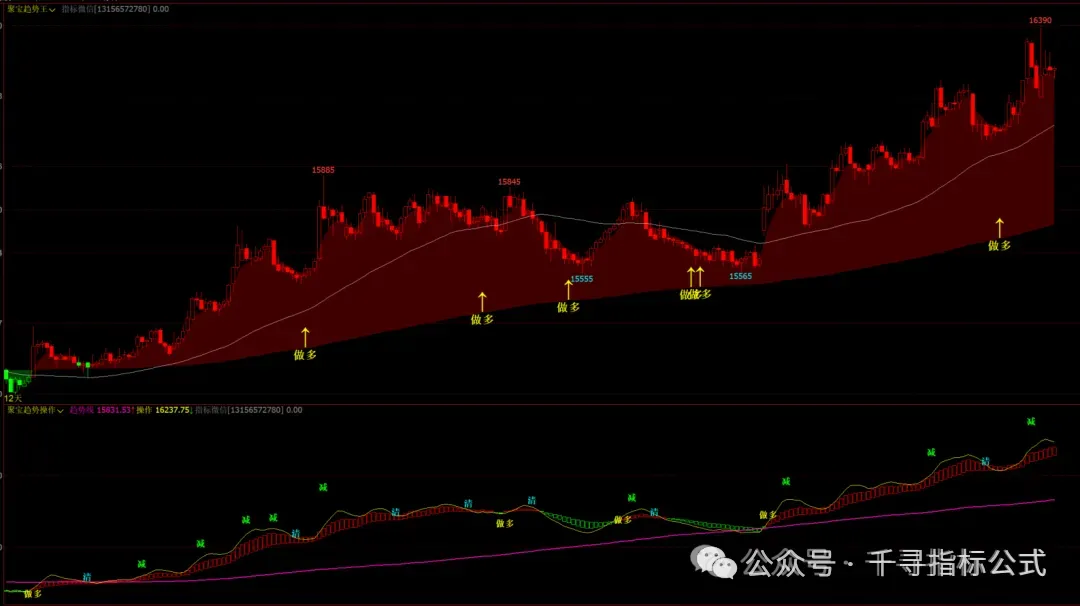 聚宝趋势操作幅图:多空红绿柱,趋势线,做多,清,减提示