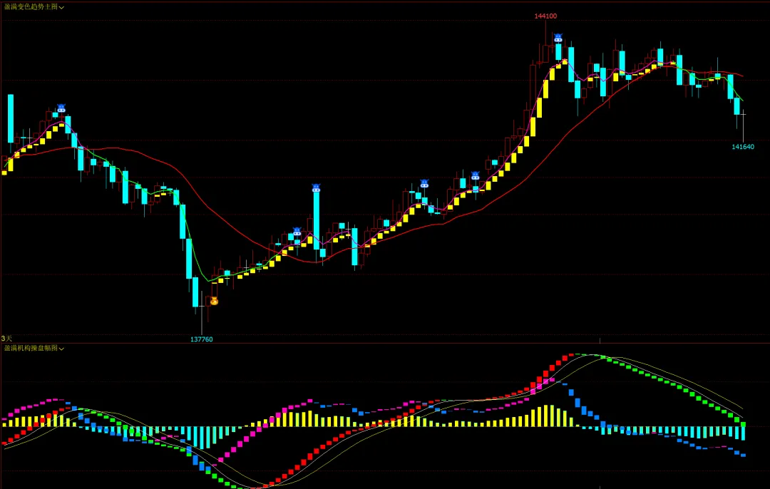 盈满变色趋势主图:趋势线,黄柱多,趋势线