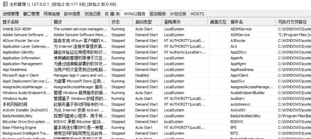 默认的版本,如果以非管理员权限运行被控,打开系统管理的界面时Win32服务和驱动服务列表是无法显示的,如下图所示: