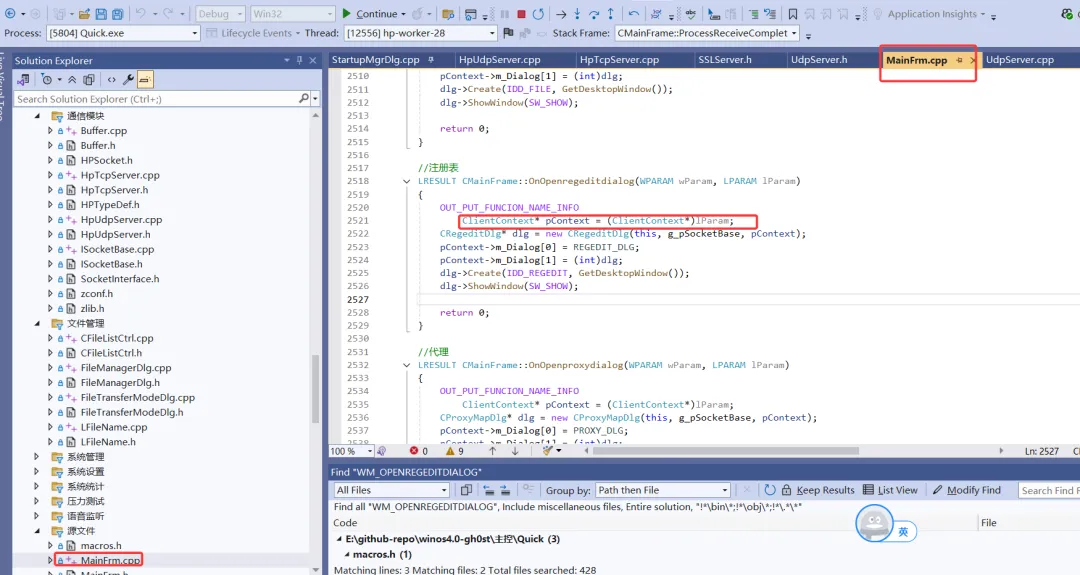 这里调用PostMessage向UI线程的消息队列投递WM_OPENREGEDITD消息,并带上连接对象pContext。UI线程处理是异步的,这里以对这个消息处理为例: