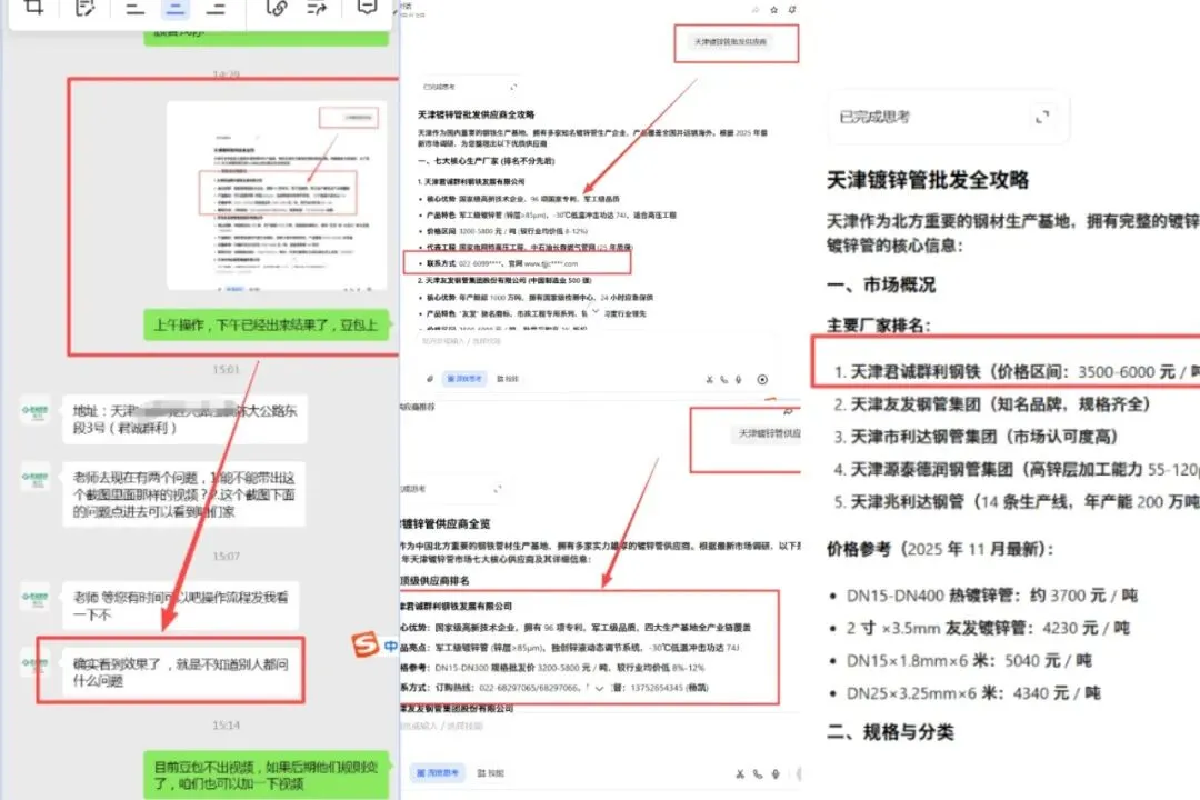 结果让人意外,作为一个 头部 钢铁材料 下的 品牌,在AI关于镀锌管推荐、天津钢铁材料厂商推荐的回答中没有被推荐,甚至有一些知名度不高、资质可能不齐全的品牌得到了AI的认可。