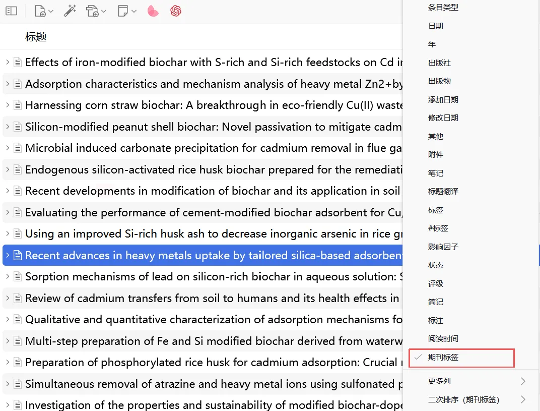 启用期刊标签列:打开 Zotero,在文献列表表头空白处右键,勾选“期刊标签”,新增专属显示列;