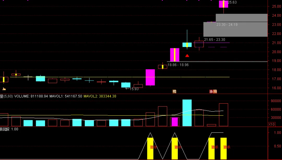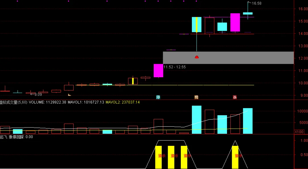 DRAWTEXT(涨停回踩,0.45,’猎杀’),COLOR00CC00;