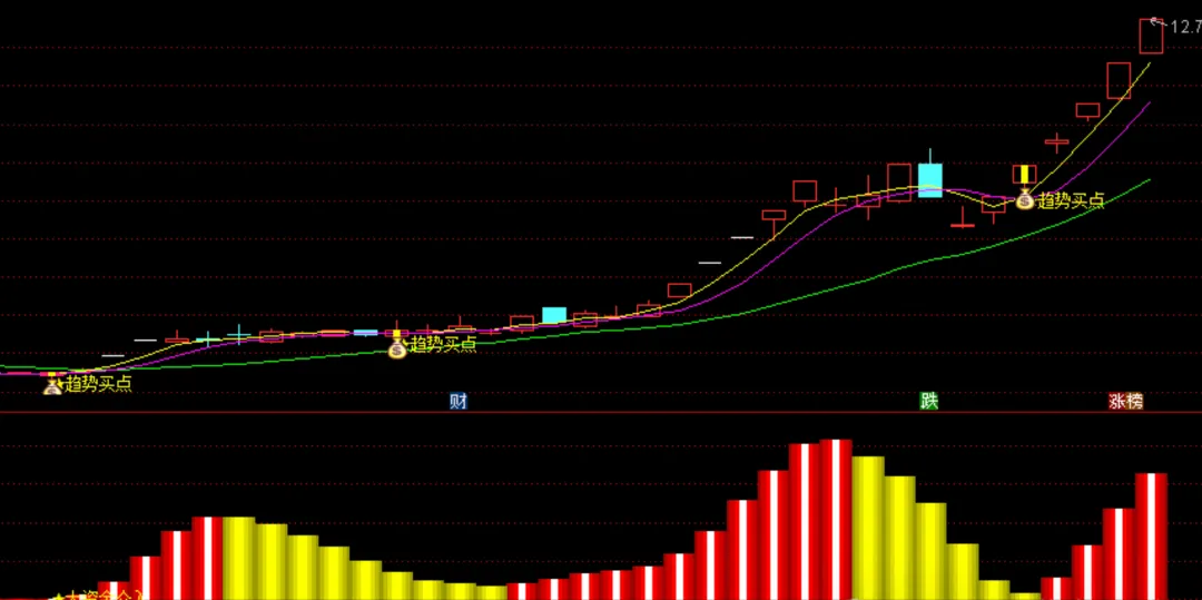 条件 :主图K线一直运行在绿色趋势线上方(多头排列)。 股价回调不破绿线,再次反身向上。 主图出现黄色K线(趋势买点),且副图资金柱持续翻红。 操作 :这就是传说中的“空中加油”。趋势没坏,资金在买,此时不加仓更待何时?