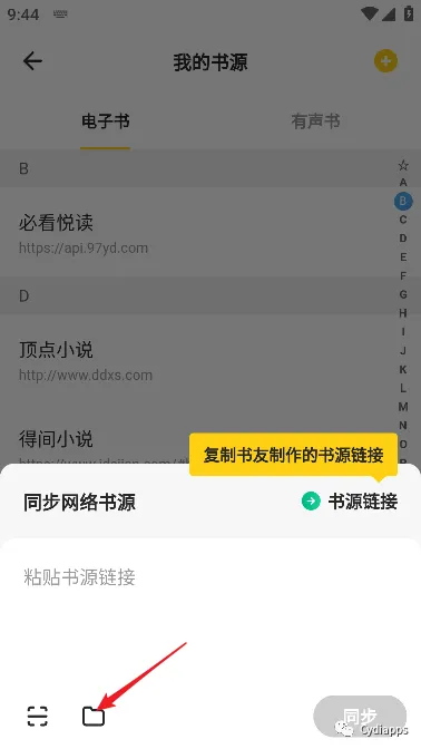 然后在爱阅书香书架上的书源配置界面上打开同步功能。