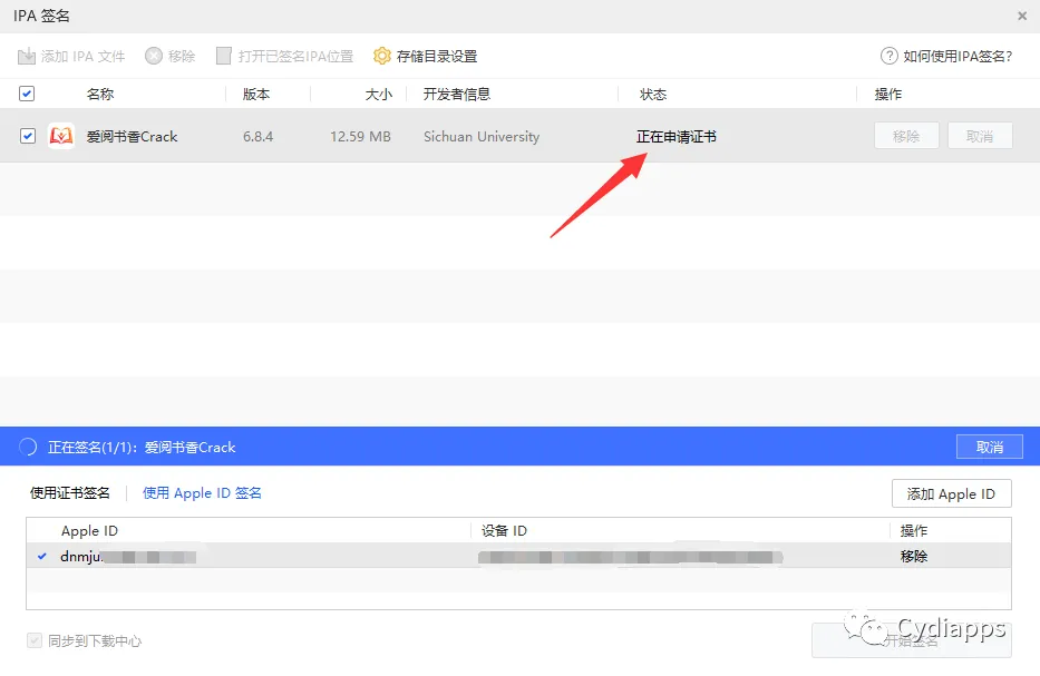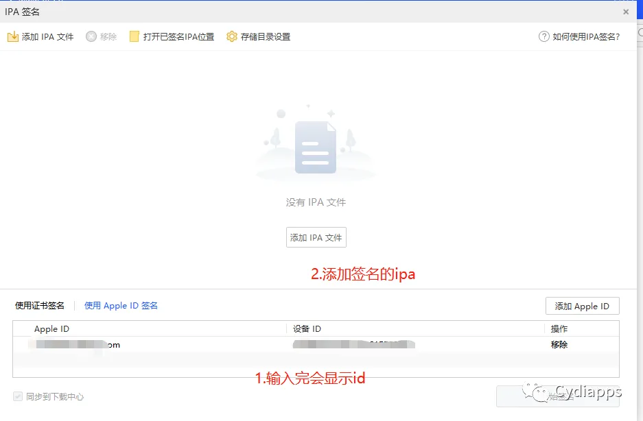 点击使用Apple ID签名,然后输入你的ID账号和密码进行签名,设备标识指的是你要给他签名的设备的标识,在打开爱思助手后,插入数据线连接上设备会自动识别。输完ID和密码点击确定。