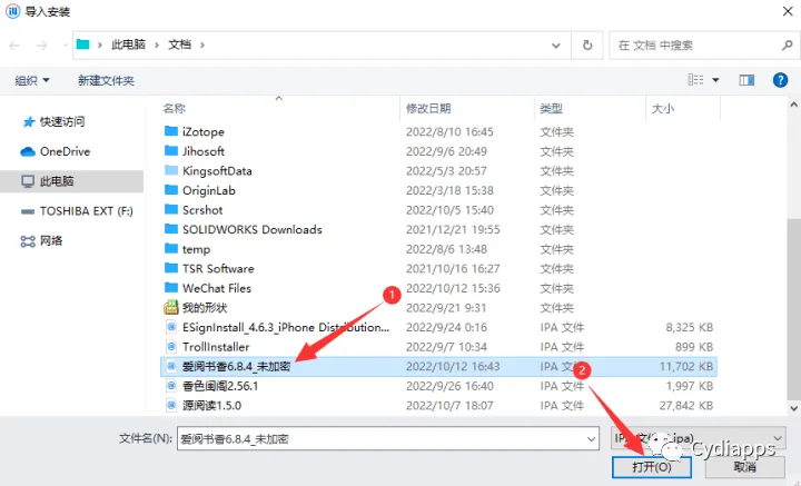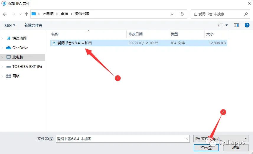 3、在弹出的窗口里选择刚刚下载的IPA文件,