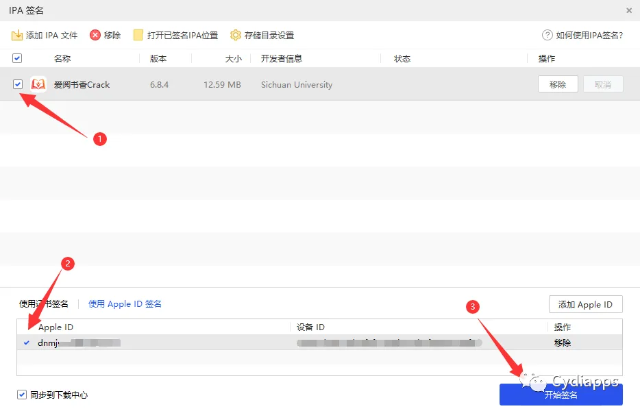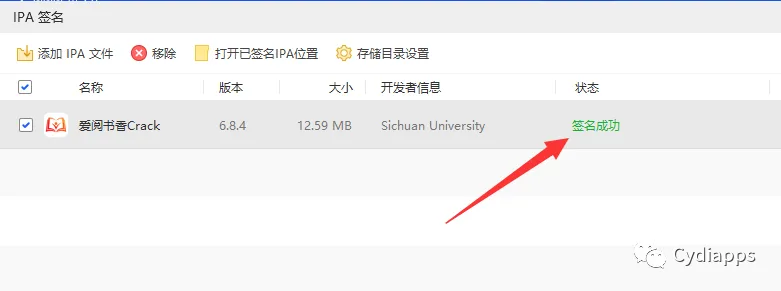 添加好ipa后,点击AppleID前和软件前的√勾选,点击开始签名,如果是显示签名成功,代表签名好了,这个时候点击 打开已签名的ipa位置,