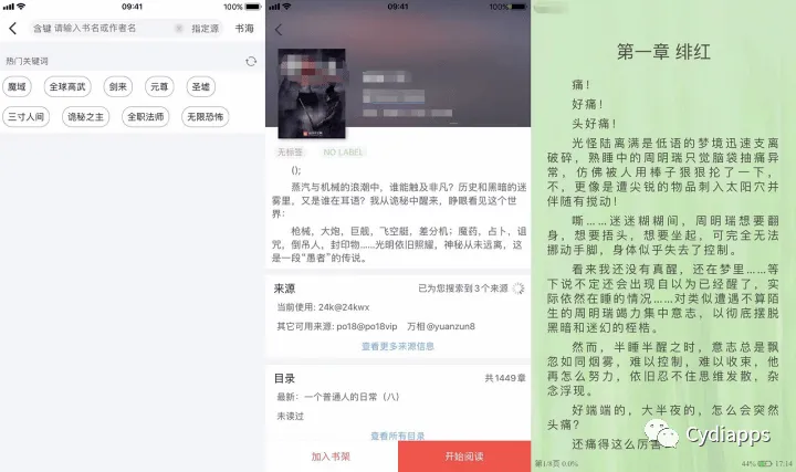 2、源阅读:优点是可导入书源、无任何广告、阅读体验超好、可用【阅读】的书源;缺点是1.4.9版本打开和切换到书架时会弹出“版本过旧”的提示。