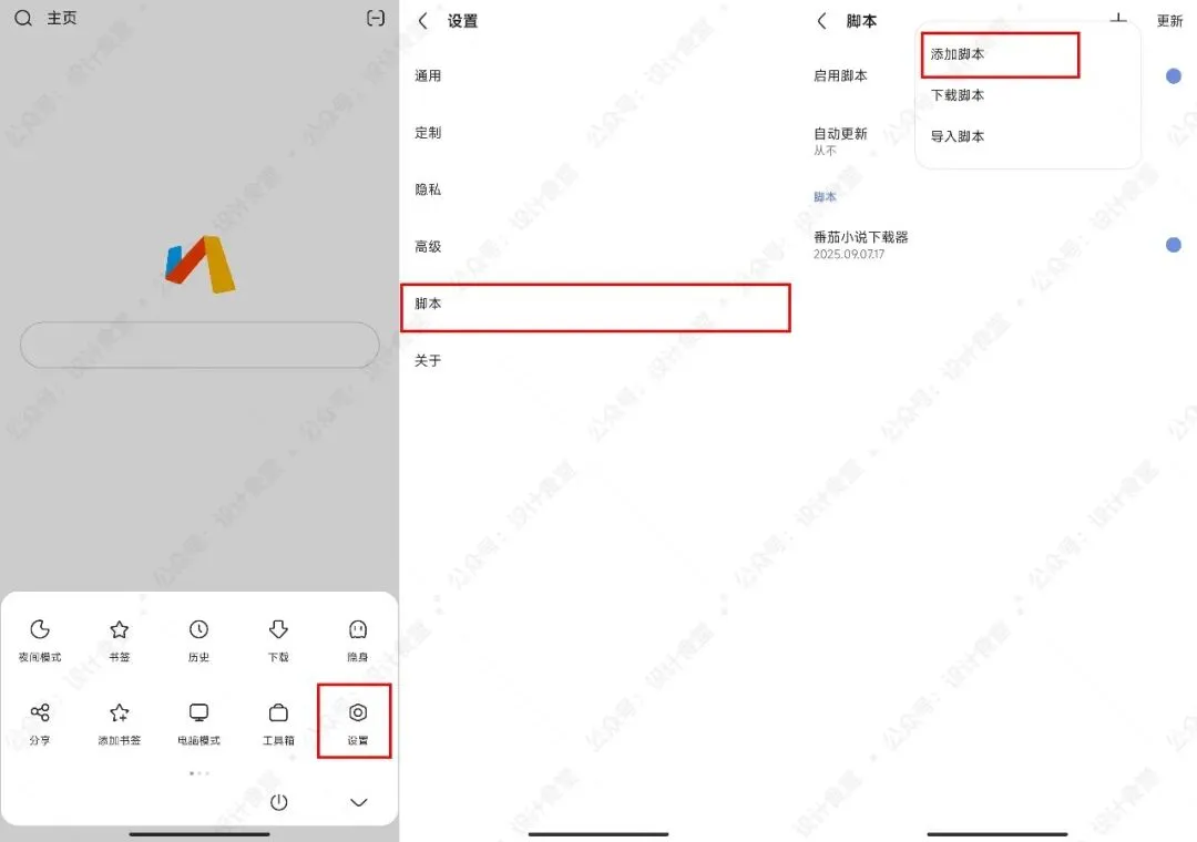 2.打开【Via浏览器】,底部找到 设置-脚本-添加脚本