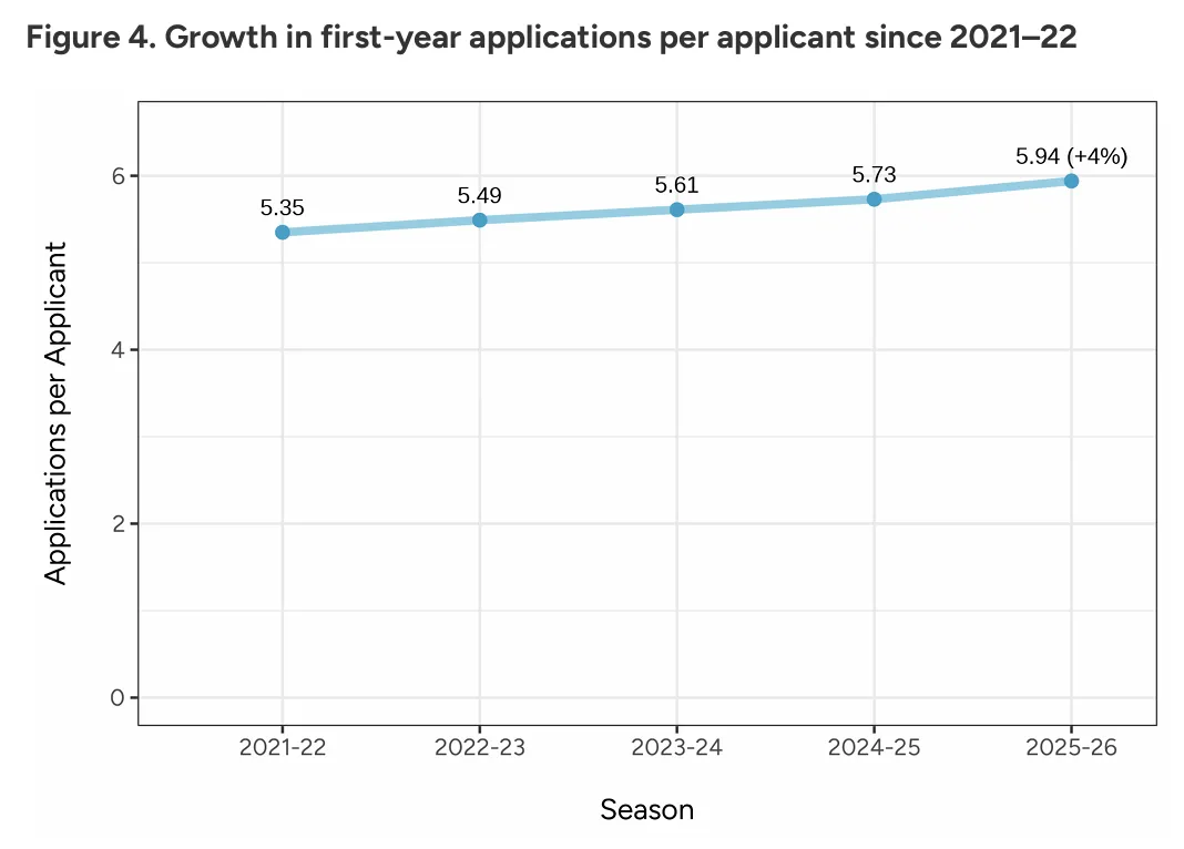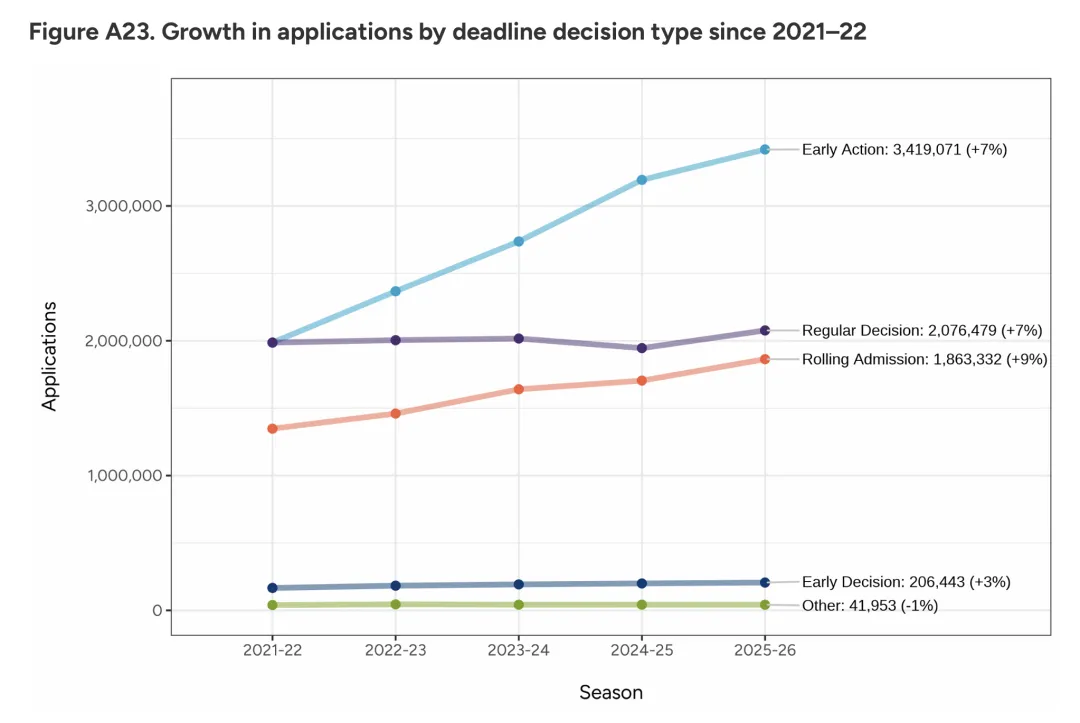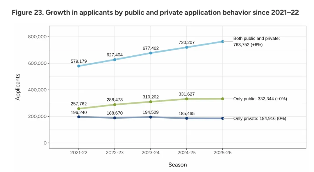 从申请者行为看,同时申请公立与私立大学的人数同比增加6%,而仅申请公立或仅申请私立的人数保持不变。
