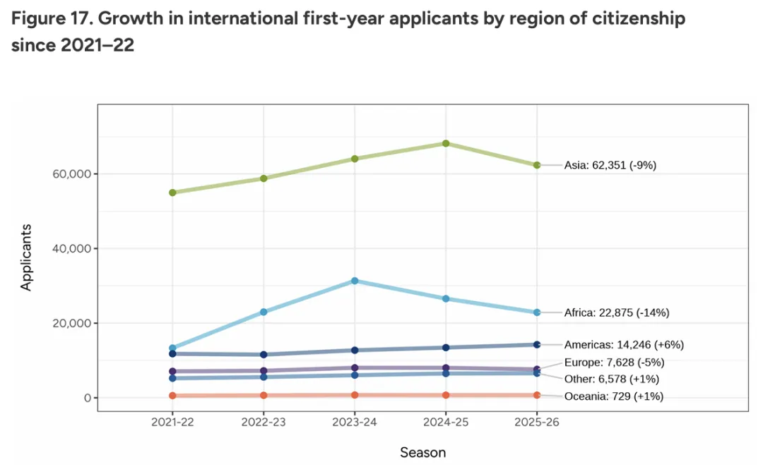 其中,非洲申请者降幅最大,为14%,亚洲申请者下降9%,欧洲申请者下降5%。